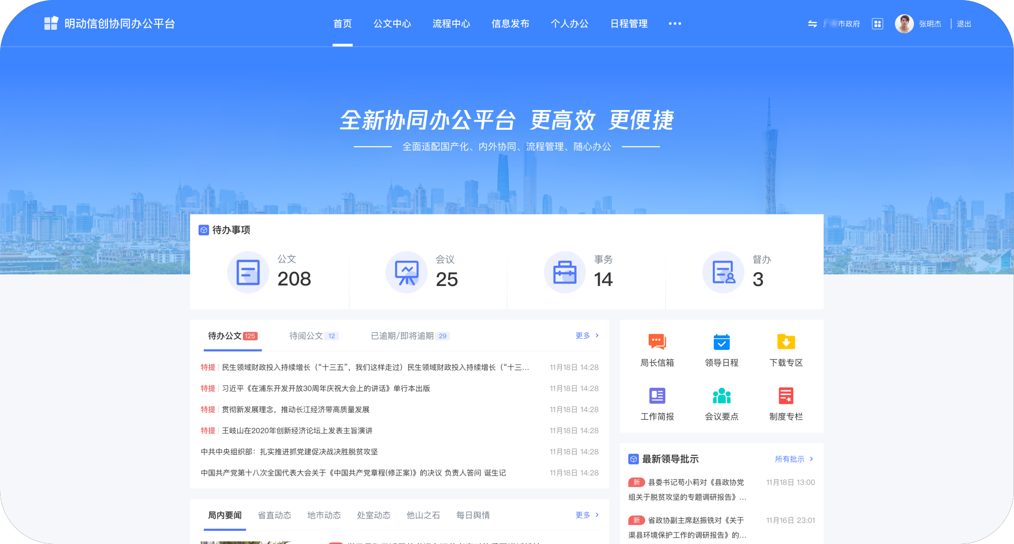 統(tǒng)一門戶整合政府內(nèi)部不同系統(tǒng)的公務(wù)事項處理入口,匯聚最新領(lǐng)導(dǎo)批示提醒,公務(wù)人員一頁辦盡所有待辦公務(wù),一面掌握核心要文信息,使政府內(nèi)部原來"人找事"轉(zhuǎn)向"事找人"。
