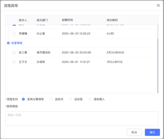 基于工作流引擎,提供各類業(yè)務(wù)流轉(zhuǎn)過程中的加辦、轉(zhuǎn)交、補發(fā)、補辦、跳轉(zhuǎn)、撤回、回退等疏導(dǎo)功能,以流程能順利推進為主要目的,避免“流程堵車”。