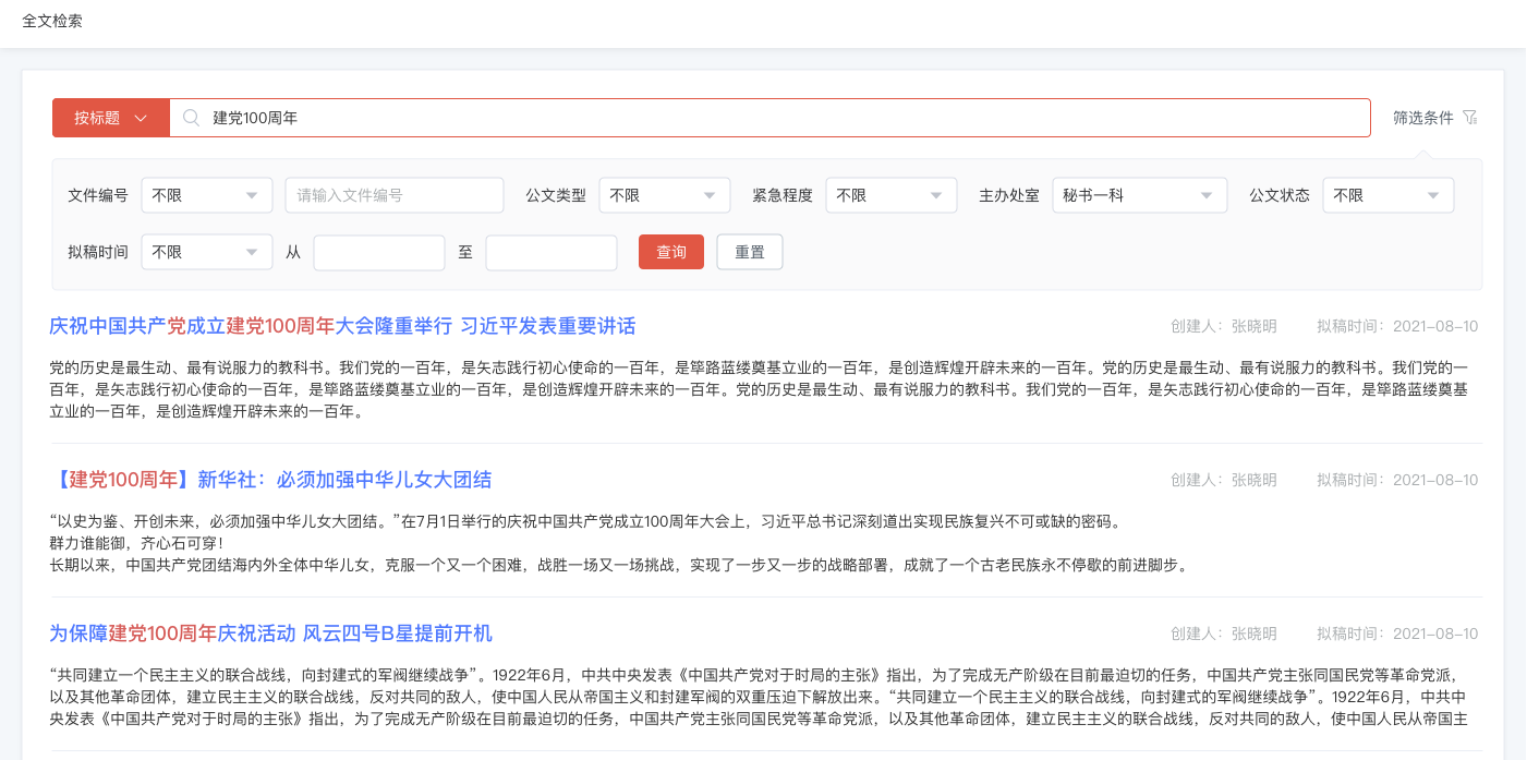 支持對公文正文、表單、附件、通知、公告、新聞、會議、事務(wù)、督辦、待辦消息等信息進行全文檢索。