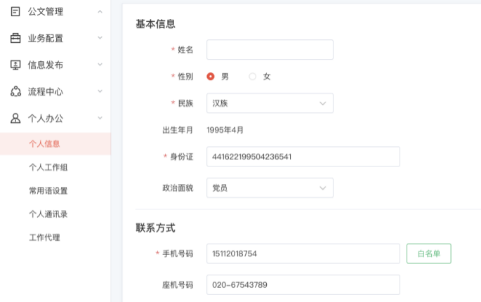 以用戶為角度提供其個人信息設(shè)置、賬戶管理、工作組、常用語、通訊錄、委托辦理、個人收藏、快捷辦文管理。
