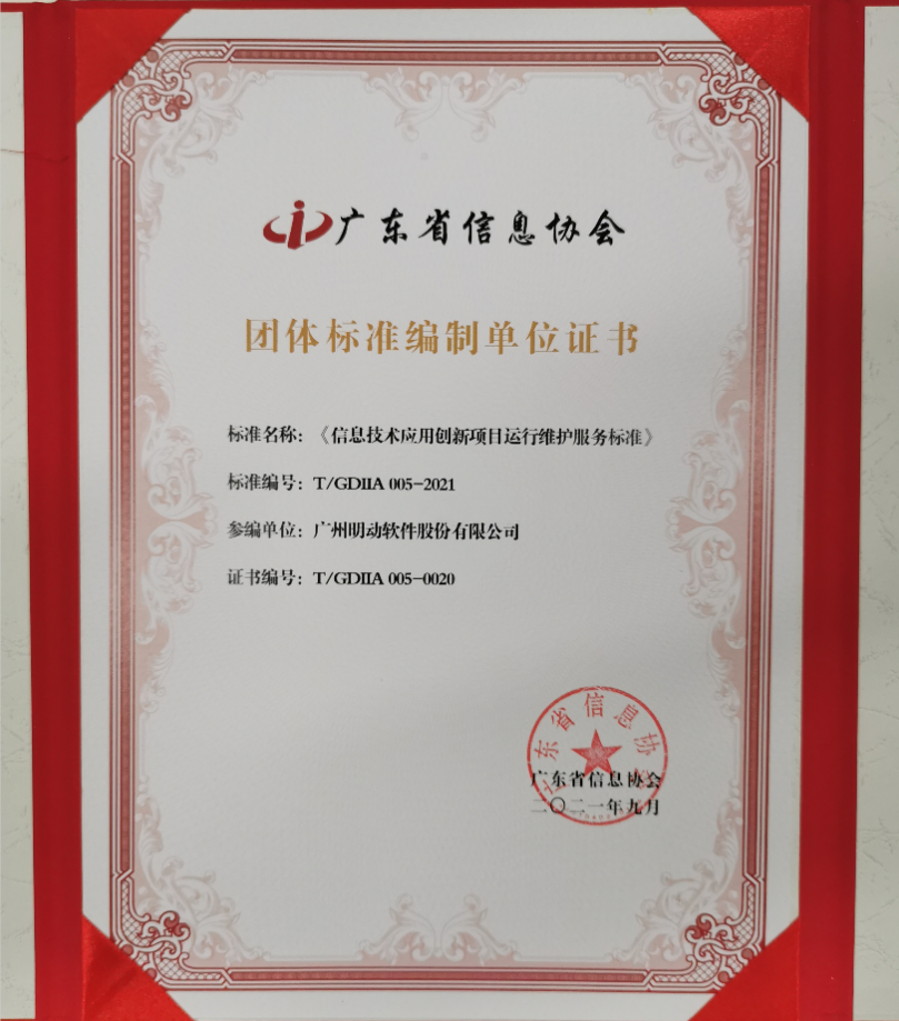 與此同時,明動軟件受邀參與了由廣東省通信產業(yè)服務有限公司聯(lián)合中通服建設有限公司、 工業(yè)和信息化部電子第五研究所、廣東廣信通信服務有限公司、 廣東省信息工程有限公司等企業(yè)、研究機構共同成立的團體標準編制組,共同參與編制《信息技術應用創(chuàng)新項目運行維護服務標準》,為規(guī)范信創(chuàng)項目運行維護服務的實施,促進信創(chuàng)行業(yè)持續(xù)發(fā)展提供助力。不僅如此,明動還被評為“廣東省信息協(xié)會2021年度優(yōu)秀會員”。