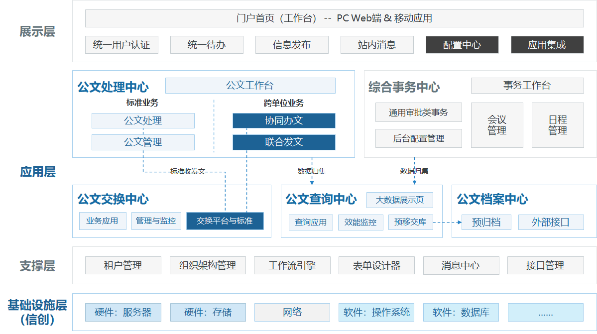 本方案以多租戶“按需開通系統(tǒng)”的方式,采用微服務、模塊化的架構,滿足黨政機關的公文處理中心、公文交換中心、公文查詢中心、公文檔案中心和綜合事務中心的“4+1”中心體系需求,滿足客戶“廣覆蓋、快部署、靈活用”的場景,以“標準+定制”一體化系統(tǒng)實現省、市、區(qū)縣、街、村等5級區(qū)域覆蓋,充分解決了黨政單位/部門“辦公系統(tǒng)繁雜、架構參差、系統(tǒng)不穩(wěn)定、信息不通、信息冗余”等辦公協(xié)作問題,切實提升了黨政單位之間辦公效率和協(xié)作能力,得到了廣大客戶的認可。