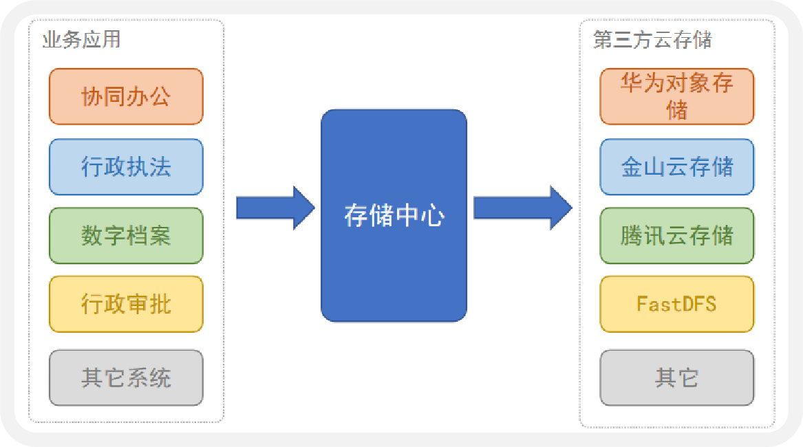 存儲中心為所有業(yè)務系統(tǒng)提供了標準的文件存儲功能,系統(tǒng)集成了插件化管理功能,提供了簡單易用的可視化管理界面。開發(fā)者通過存儲中心,可以快速對接到各類文件存儲系統(tǒng),如 FastDFS、本地磁盤存儲或第三方對象存儲系統(tǒng)。在面向不同的客戶群體時,業(yè)務系統(tǒng)可以在不變更代碼的情況下,通過存儲中心的可視化界面配置,即可快速切換各類文件存儲系統(tǒng),有效提升項目的開發(fā)效率。