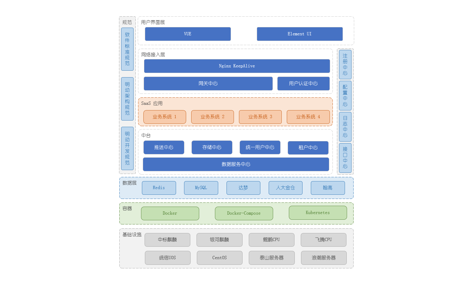 魔方平臺在標準 Spring Cloud 微服務架構上,將大量通用功能封裝成標準化功能組件,制定了一系列軟件開發(fā)規(guī)范,為應用提供了健全的開發(fā)環(huán)境。魔方平臺提供了九大基礎組件,涵蓋了接入、用戶、認證、權限、配置、存儲、推送、開放、審計、統(tǒng)計、SaaS化等方面的基礎功能,支持負載均衡、彈性伸縮、灰度發(fā)布等特性,為業(yè)務系統(tǒng)的高性能、高可用、高擴展提供了技術基礎。