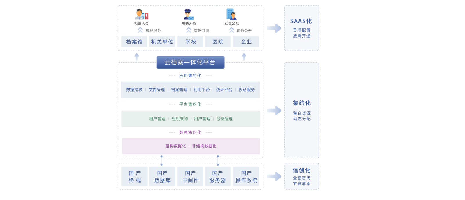 云檔案一體化平臺(tái)采用高內(nèi)聚、松耦合的基于微服務(wù)架構(gòu)的開發(fā)模式設(shè)計(jì),將業(yè)務(wù)分解轉(zhuǎn)換為多個(gè)可管理的服務(wù),例如業(yè)務(wù)支撐、數(shù)據(jù)交換、文件管理、檔案管理、檔案利用,其他弱業(yè)務(wù)核心關(guān)聯(lián)的如業(yè)務(wù)督導(dǎo)、消息推送、統(tǒng)一用戶認(rèn)證、圖表報(bào)表、數(shù)字簽名、四性檢測(cè)等,每個(gè)微服務(wù)自由選擇開發(fā)技術(shù),獨(dú)立部署,獨(dú)立擴(kuò)展,可根據(jù)每個(gè)服務(wù)的規(guī)模來部署滿足需求的軟硬件資源。