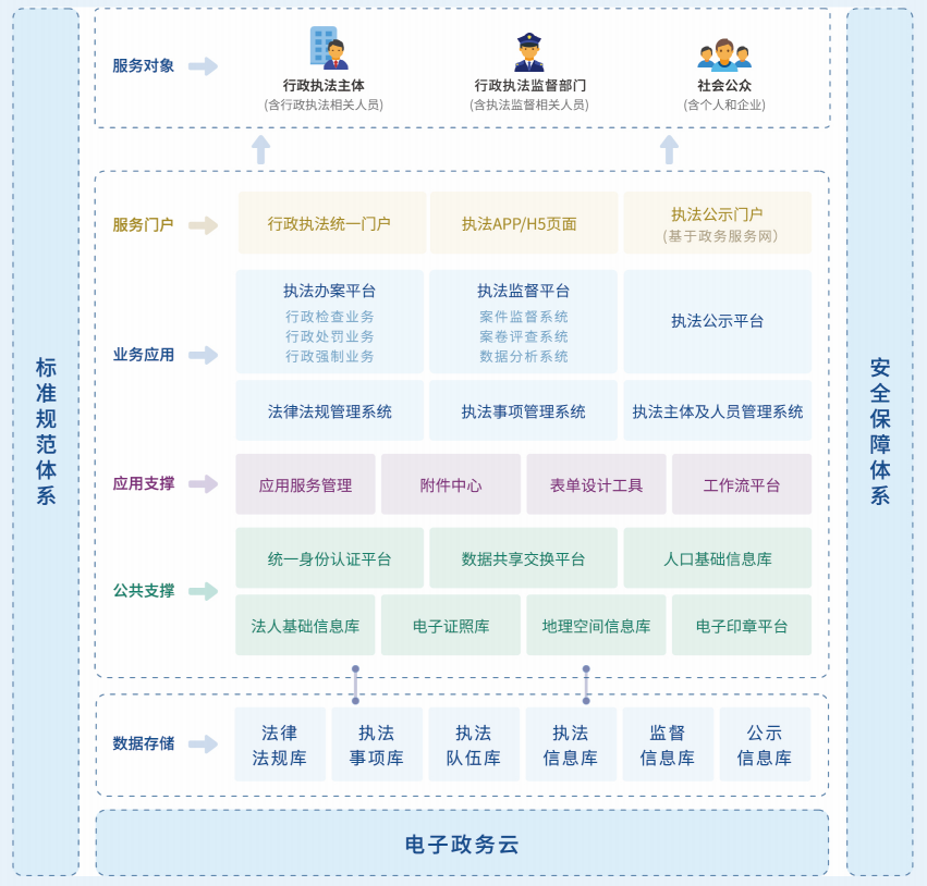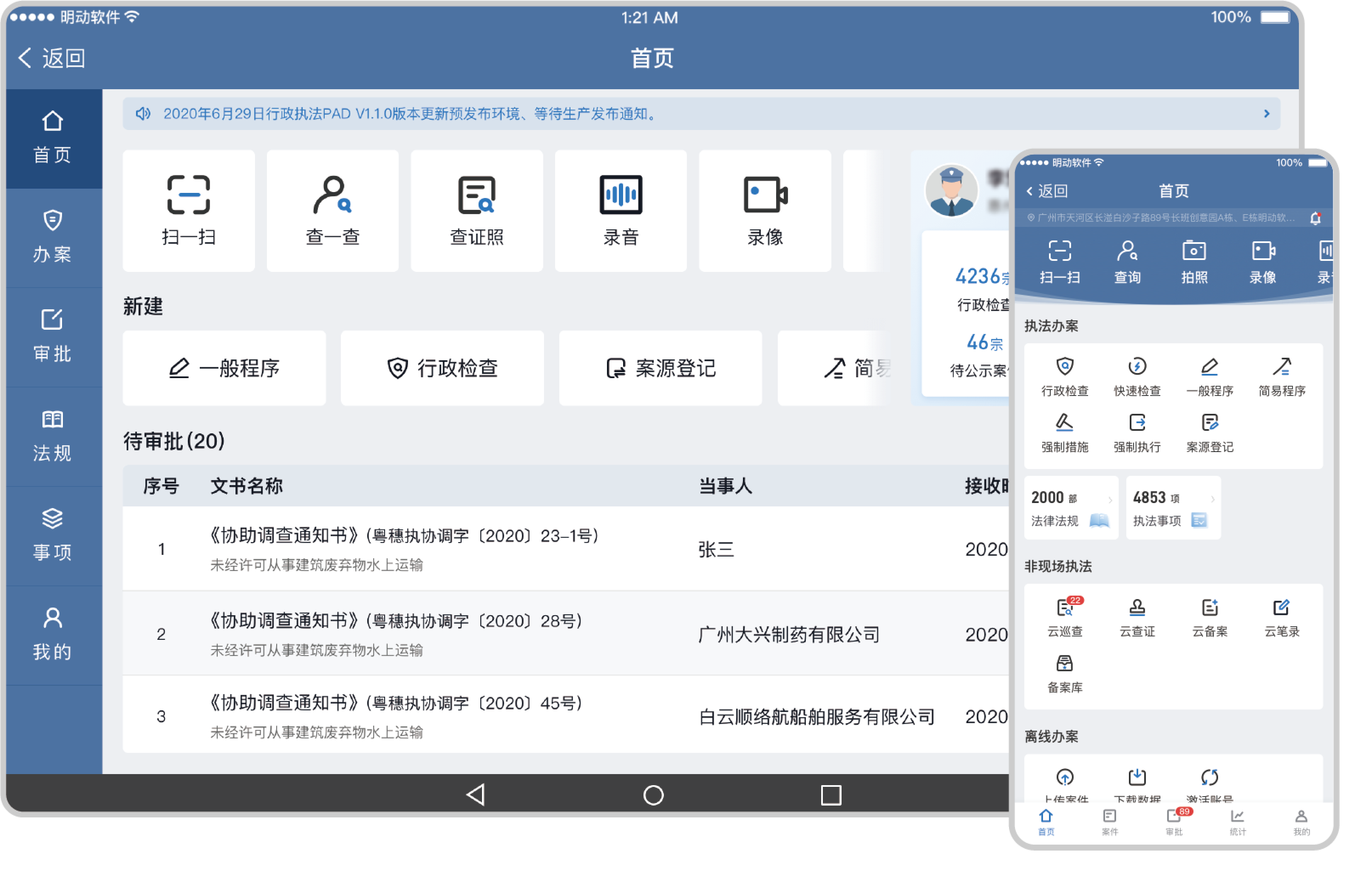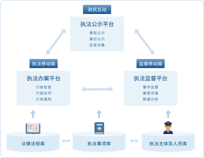 明動(dòng)行政執(zhí)法一體化平臺(tái)圍繞“法律法規(guī)、執(zhí)法權(quán)力、執(zhí)法人員、執(zhí)法案件”四個(gè)核心要素,以法律法規(guī)為源頭,構(gòu)建行政執(zhí)法與監(jiān)督一體化應(yīng)用,集行政權(quán)力動(dòng)態(tài)管理、行政權(quán)力規(guī)范運(yùn)轉(zhuǎn)、行政權(quán)力智能監(jiān)督于一體,通過“把行政權(quán)力關(guān)進(jìn)信息化的籠子”,實(shí)現(xiàn)“法無授權(quán)不可為”的法治理念。該平臺(tái)以行政檢查、行政處罰、行政強(qiáng)制三類業(yè)務(wù)為核心,建設(shè)有三庫三平臺(tái),即①法律法規(guī)庫、②執(zhí)法事項(xiàng)庫、③執(zhí)法主體及人員庫、④執(zhí)法辦案平臺(tái)、⑤執(zhí)法監(jiān)督平臺(tái)、⑥執(zhí)法公示平臺(tái),滿足日常執(zhí)法辦案和監(jiān)督場(chǎng)景需求,并同步打造PC、手機(jī)、平板三端應(yīng)用,實(shí)現(xiàn)“規(guī)范行政執(zhí)法行為,提高行政執(zhí)法效能、強(qiáng)化行政執(zhí)法監(jiān)督”的總體目標(biāo)。